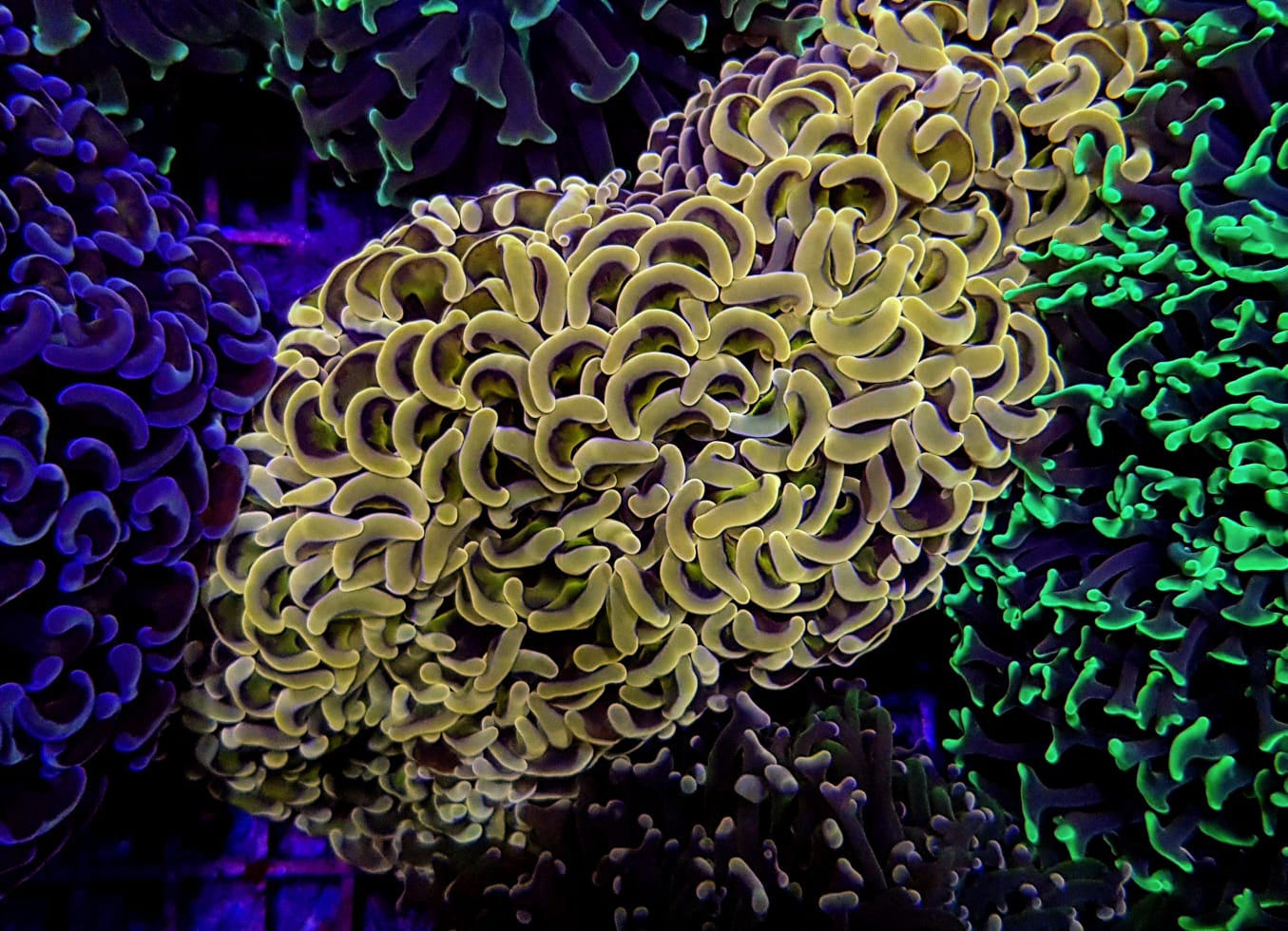 de yellow-gold hammer coral heeft matige tot felle verlichting nodig. een geleidelijke aanpassing aan helderder licht voorkomt stress. blauw-spectrum ledverlichting versterkt de fluorescerende kleuren.