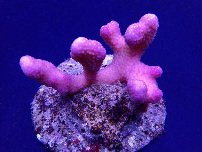 Stylophora pistillata (Tonga) is a small-polyp stony coral (SPS) that differs from other Stylophora varieties due to its thicker branches and robust structure. It displays deep pink to purple hues with contrasting polyps, making it a standout addition to reef tanks.